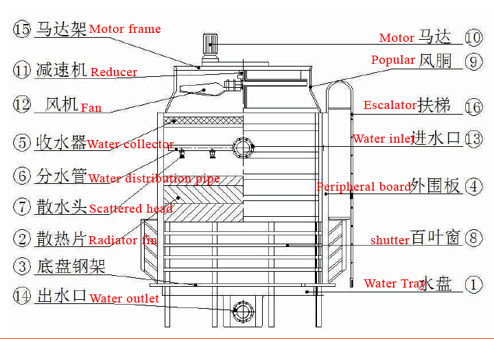 2. External circulation: driven by the spray pump, spray water from the sink to the sprinkler system, after the water jet cooling coil contact with the heat exchange, part of the hot steam through the fan discharge, the spray water after cooling fell to Sink again after the cycle.